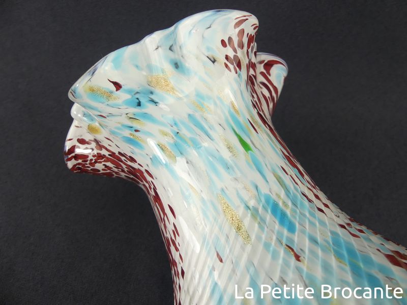 Très beau vase balustre en verre soufflé polychrome de Clichy à col festonné. Relief en torsade sur le cors du vase. Décor polychrome brum, blanc, bleu, doré pailleté en majorité. Très bel état, traces d'usage.