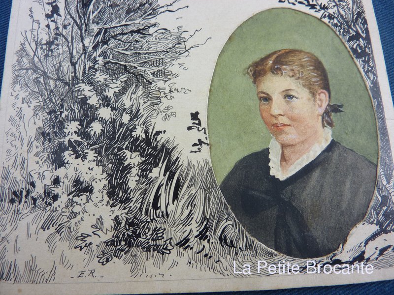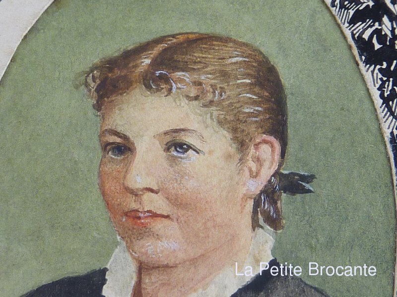 Joli portrait à la gouache monté en médaillon sur un dessin de sous-bois à l'encre. Signature E.R. en bas à gauche. Annotation au dos. Travail de la fin du XIXe siècle.
