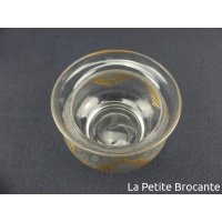 Partie de service de nuit en verre peint XIXe. Il est composé d'un sucrier ou bonbonnière, d'une grande carafe avec son bouchon d'origine, d'une petite carafe sans bouchon, le tout présenté sur un large plateau rond en verre. Décor de petits points bleus et de filets et draperies dorés.Le sucrier est en très bel état de conservation, peu d'usure. La grande carafe est marquée de dépôt calcaire. Le petit flacon est en bon état. Le plateau présente des usures et des rayures.