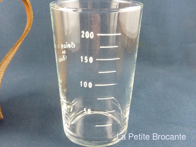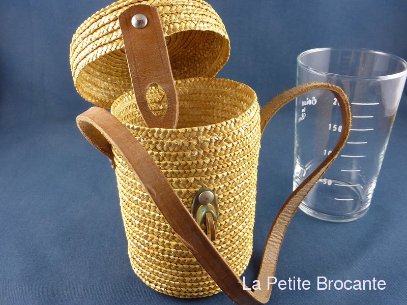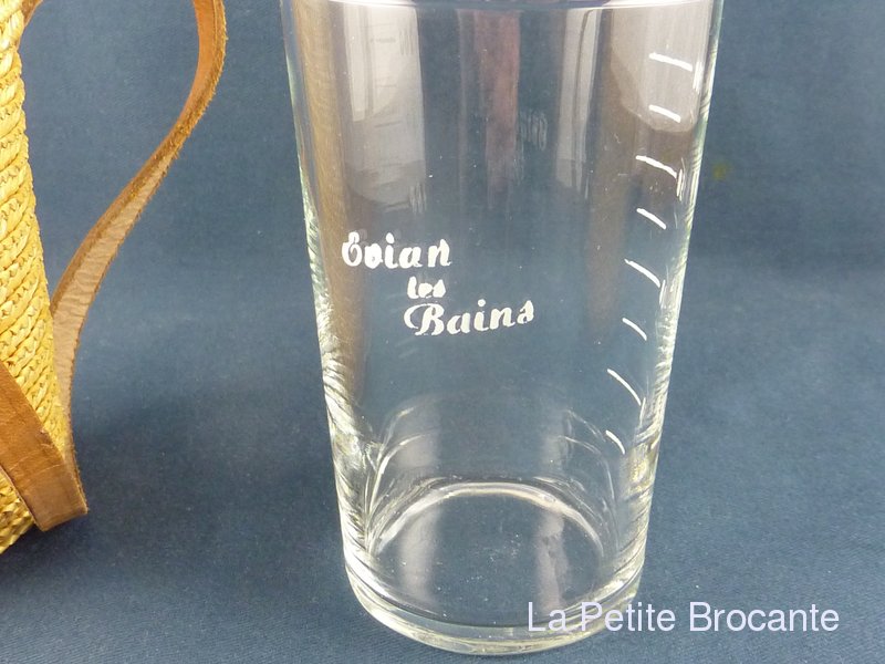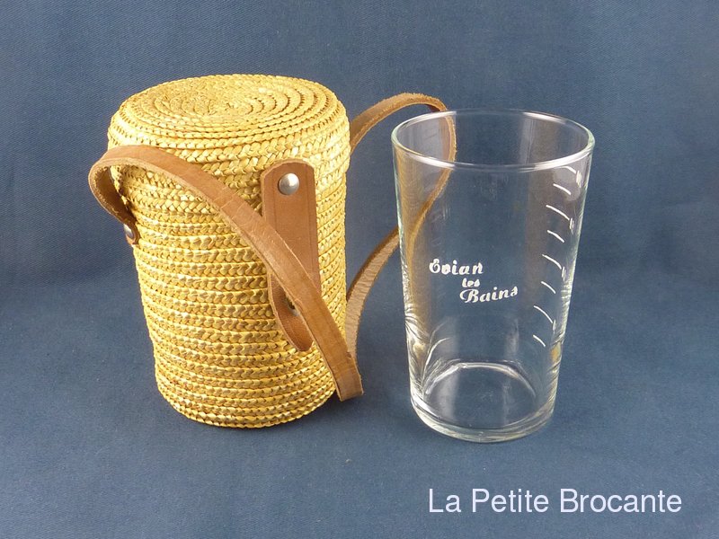 Ancien  verre de curiste de la station thermale de Évian les Bains. Verre gradué en très bel état dans son étui en vannerie de paille et cuir. Très bon état.